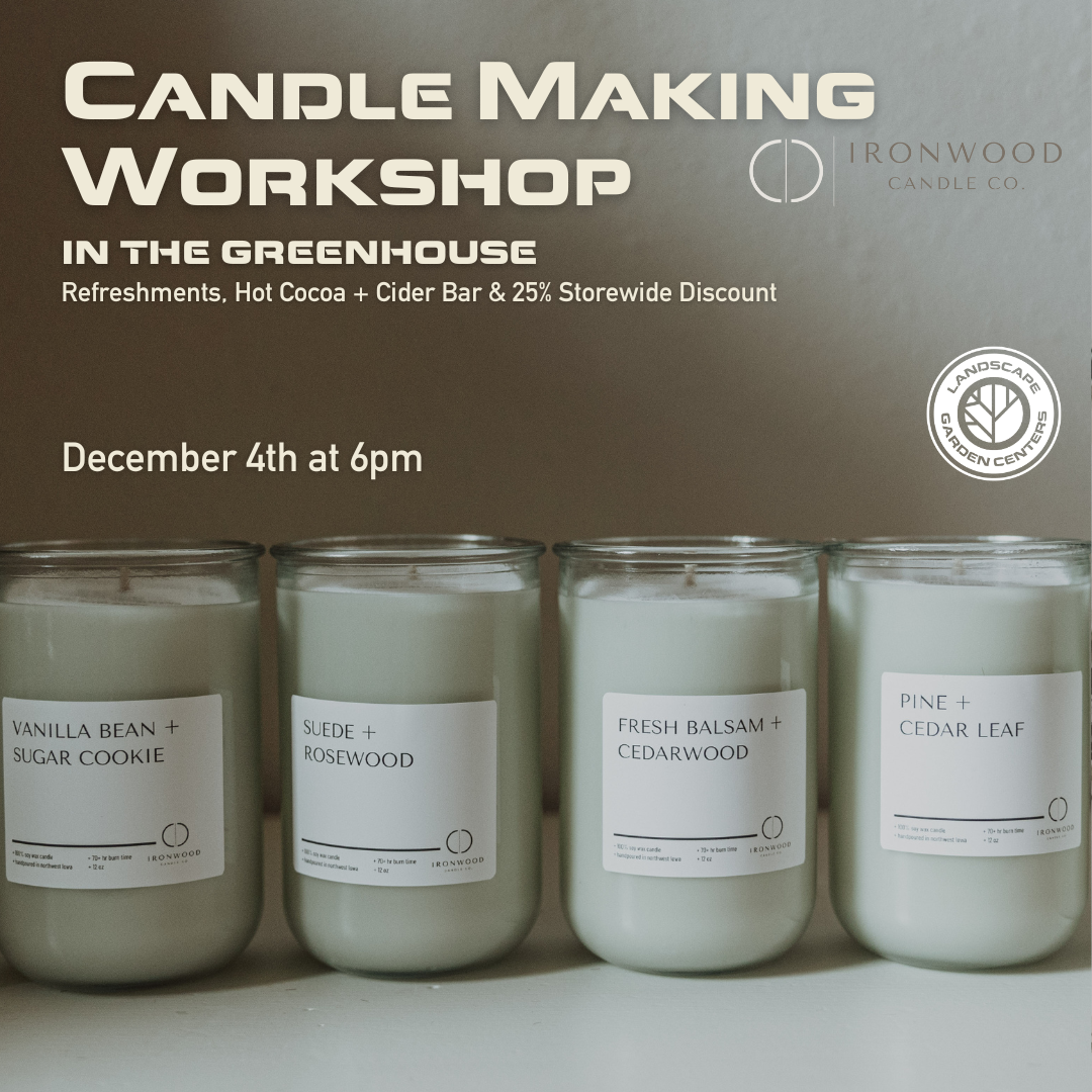 We are so excited to welcome Ironwood Candle Co of George, IA to our Garden Center for a candle making workshop! Just in time for the holidays, it's the perfect evening to celebrate the season with your friends and loved ones.